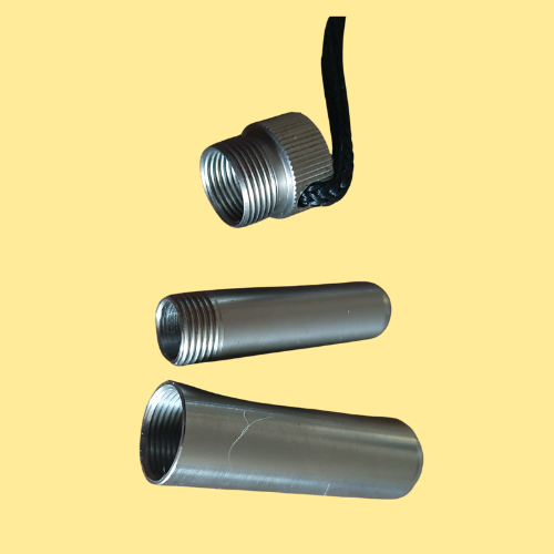 Tato sada amuletů se skládá z ocelového pouzdra, které lze rozložit na tři části. Pomocí šroubovacího uzávěru se snadno sestaví a lze jej pohodlně nosit na krku s přiloženým koženým řemínkem.